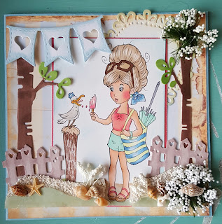 My stamp is by The Paper Shelter "That's something you don't see every day". My background paper is from the Sherri Baldy my sailor girl paper pack. Tree, fence and bunting and doily dies. The beach sand is part of a Jolees sticker...yip...you read correctly...I went thru my stickers this week. Hot glued some flowers and shells on.