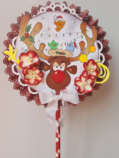 I made a lollipop card using The Paper Shelter Rooftop Party digital stamp. I coloured the image with Copics and used florescent Copics on the Christmas lights, baubles and flourishes. I used a Martha Stewart border punch for the outside. The white doily was cut on my Cameo. The flourishes are die cuts. I added a straw, flowers and ribbon.